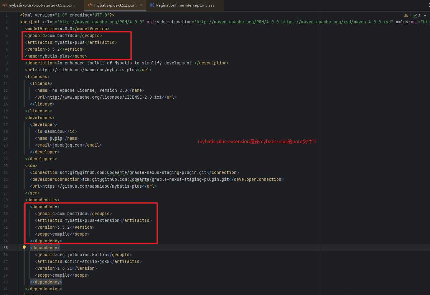 而mybatis-plus-extension依赖是被包含在mybatis-plus的pom文件里的,因此无需引入额外依赖。