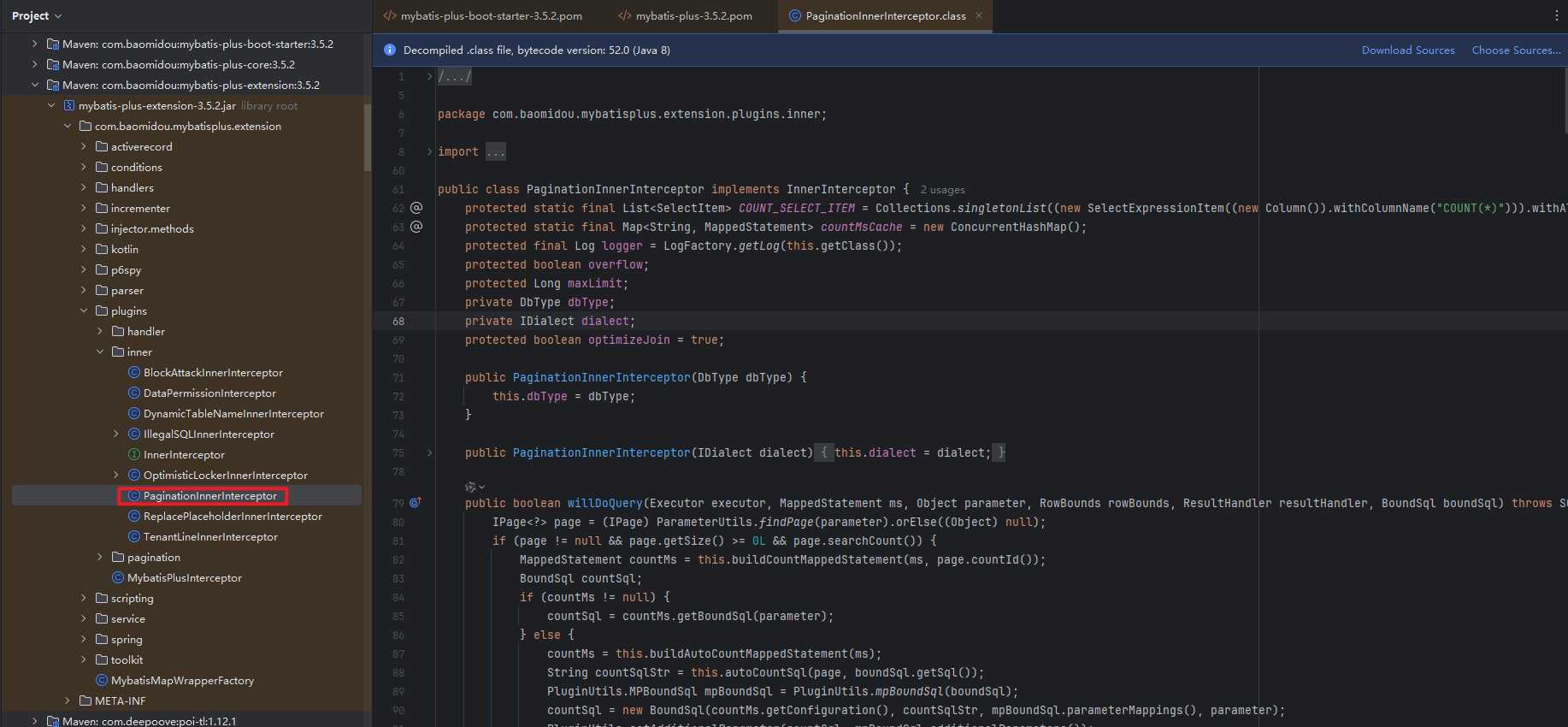 在mybatis-plus 3.5.9之前的版本,分页插件PaginationInnerInterceptor是在mybatis-plus-extension包下。如图所示: