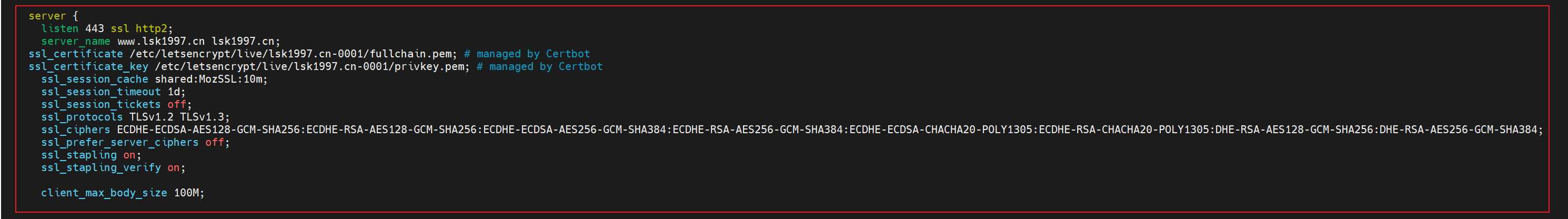 # 查看nginx配置文件,找到监听443端口的配置片段,Certbot已经自动写入的配置