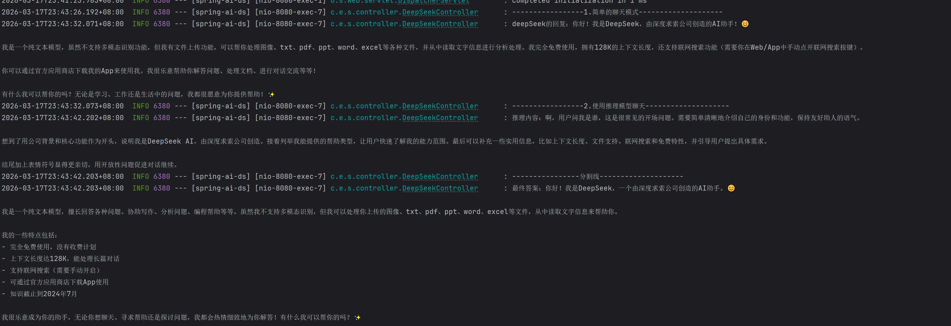 DeepSeekAssistantMessage result = (DeepSeekAssistantMessage) chatClient.prompt(prompt)