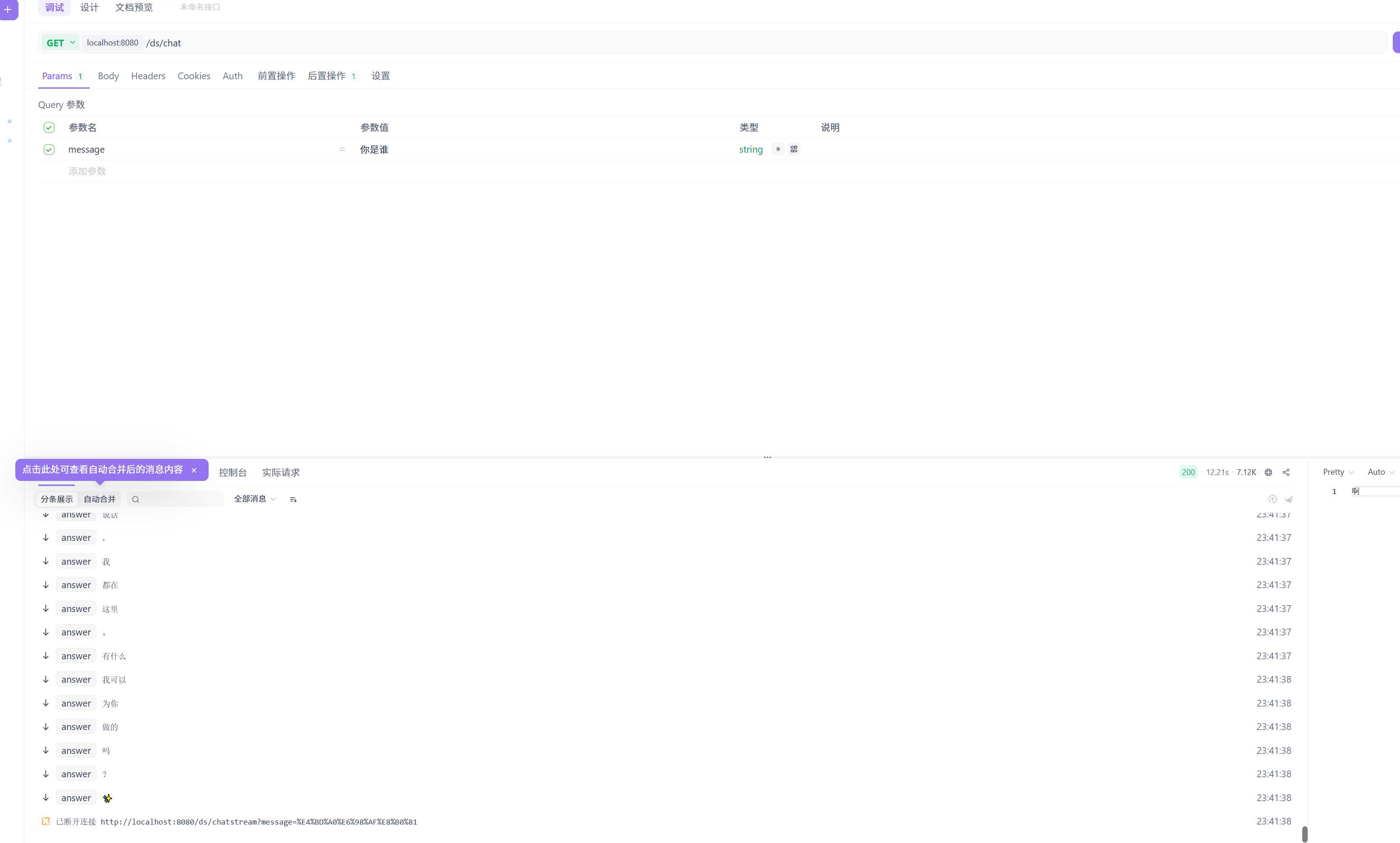 发送请求:http://localhost:8080/ds/chatStream?message=你是谁